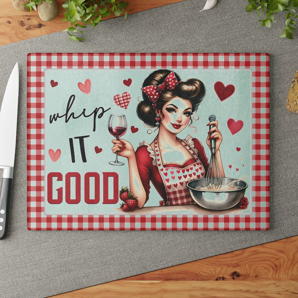 Glass Cutting Board, Vintage Pin-Up, Wine & Baking, Red Polka Dots & Hearts
